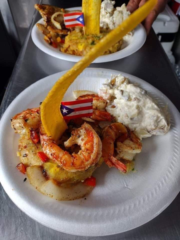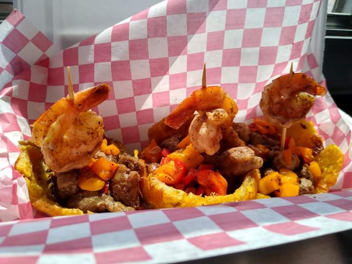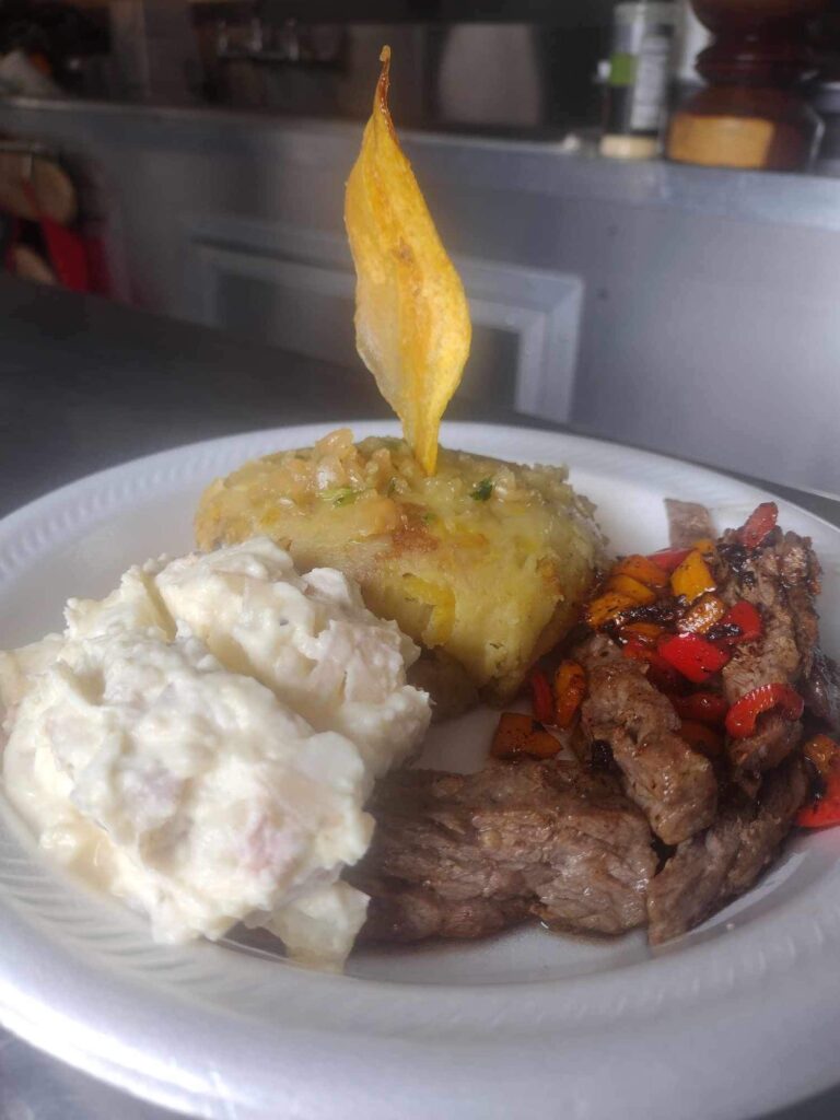 - PLANTAIN CUPS FILLED WITH SKIRT STEAK AND SHRIMP GRILLED TO PERFECTION ON GARLIC DRESSING TOPPED WITH SWEET PEPPERS AND A MINI SHRIMP KABOB PLUS ANY SALAD